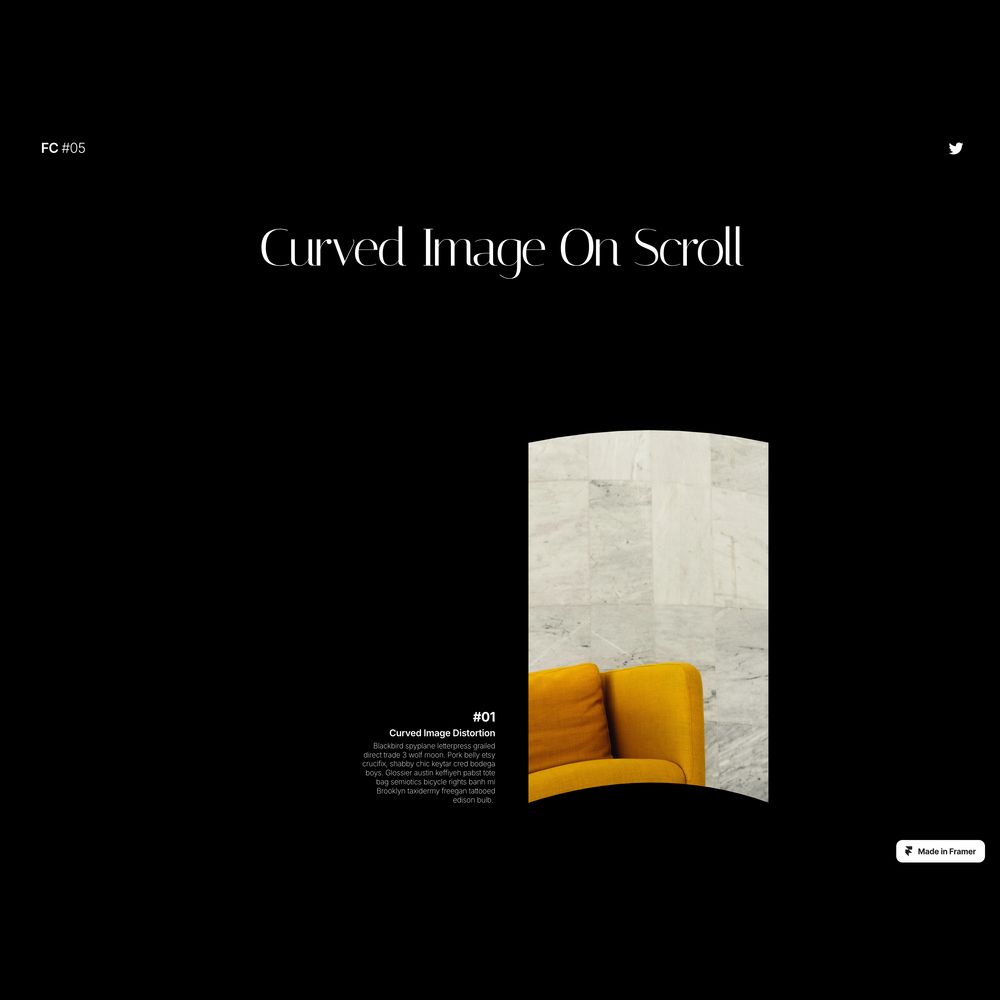A webGL component featuring a Curved Image On Scroll based on Scroll Velocity. Stack : React & React Three Fiber. Live demo Refund Policy Due to the nature of digital products and Framer, there are no refunds once a purchase is made. We recommend reviewing the product details and any available previews carefully before making a purchase.