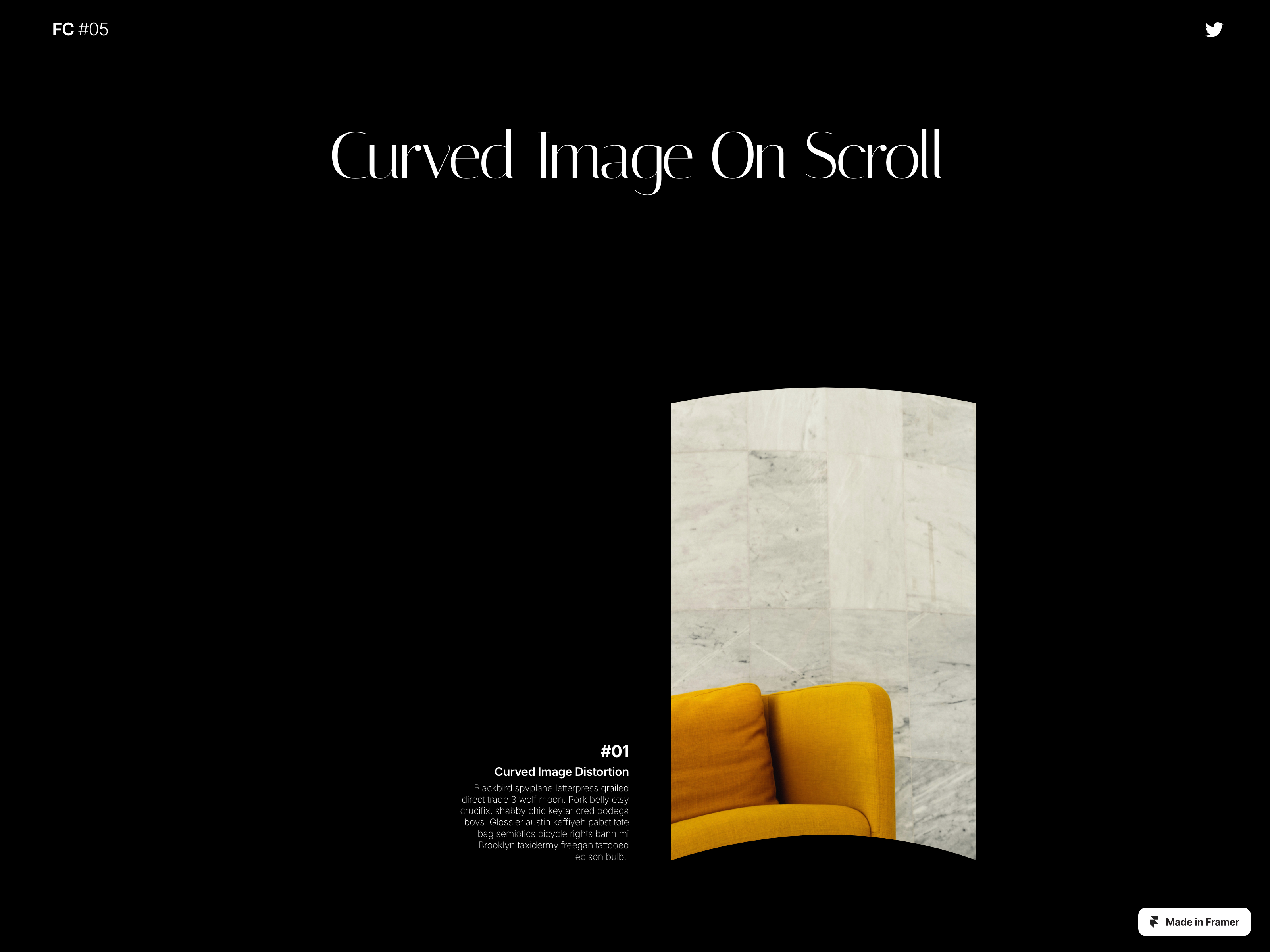 A webGL component featuring a Curved Image On Scroll based on Scroll Velocity. Stack : React & React Three Fiber. Live demo Refund Policy Due to the nature of digital products and Framer, there are no refunds once a purchase is made. We recommend reviewing the product details and any available previews carefully before making a purchase.