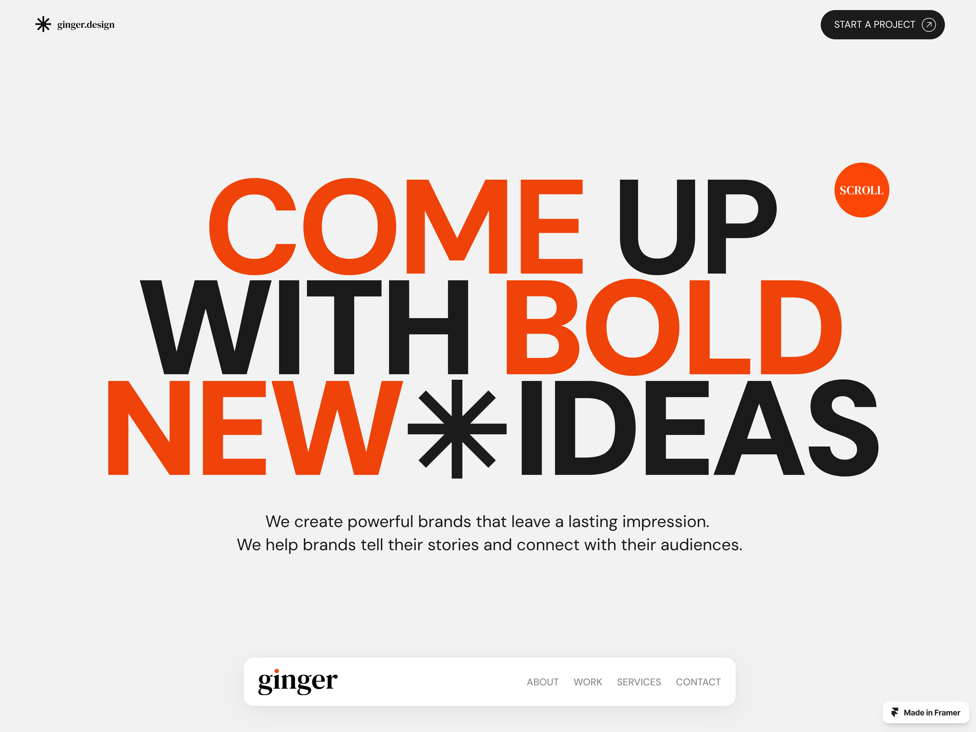 Ginger is a visually stunning Framer template designed for freelancers, creatives, agencies and portfolio to showcase their work in a timeless and elegant way. Preview: https://ginger.framer.website/ Features 5 PagesFully ResponsiveContent Management System (CMS)Custom Animations & EffectsScroll Effects and animationsCustom cursor3D transform Pages HomeAboutWorkServices404 Error Page Refund Policy Due to the nature of digital products and Framer, there are no refunds once a purchase is made. We recommend reviewing the product details and any available previews carefully before making a purchase. Plateform This template has been built on Framer