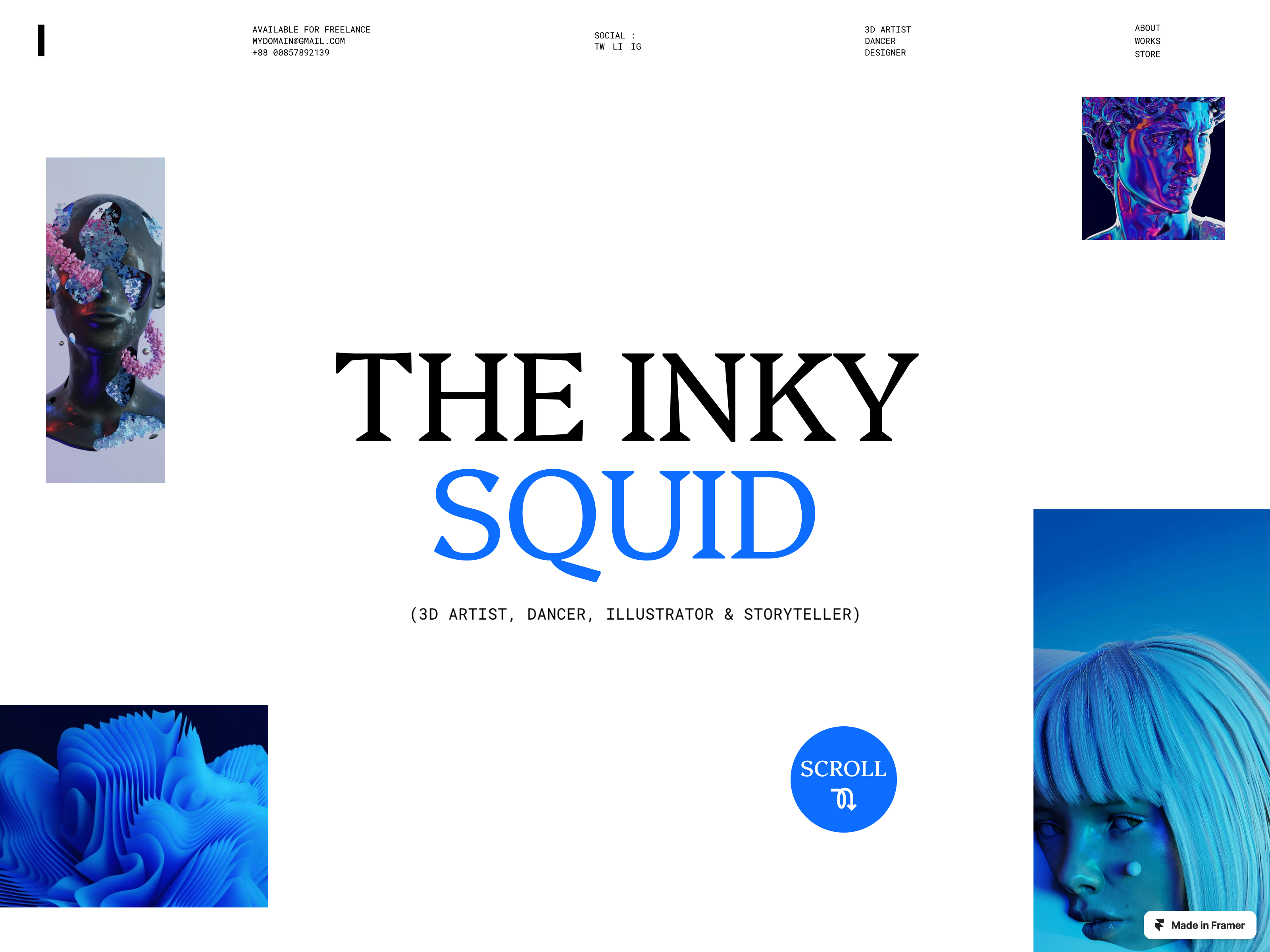 INKY a punchy Portfolio Framer Template for 3D artist, Photographer and Designers with a unique identity, storytelling and animation. INKY is an innovative Framer template tailored specifically for 3D artist, Photographer and Designers, boasting a distinctive identity characterized by compelling storytelling and captivating animations. With its versatility and attention to detail, INKY is the best to be different and remarkable in the crowdy world of artist, Photographer and Designers. Preview https://inky.framer.website/ What does RISE include? → Home Page → About Page → Works Page (CMS) → Store Page → 404 Error Page Features → Scroll Effects → Animations → Custom cursor → Breakpoints → Content Management System (CMS) Refund Policy Due to the nature of digital products and Framer, there are no refunds once a purchase is made. We recommend reviewing the product details and any available previews carefully before making a purchase. Plateform This template has been built on Framer